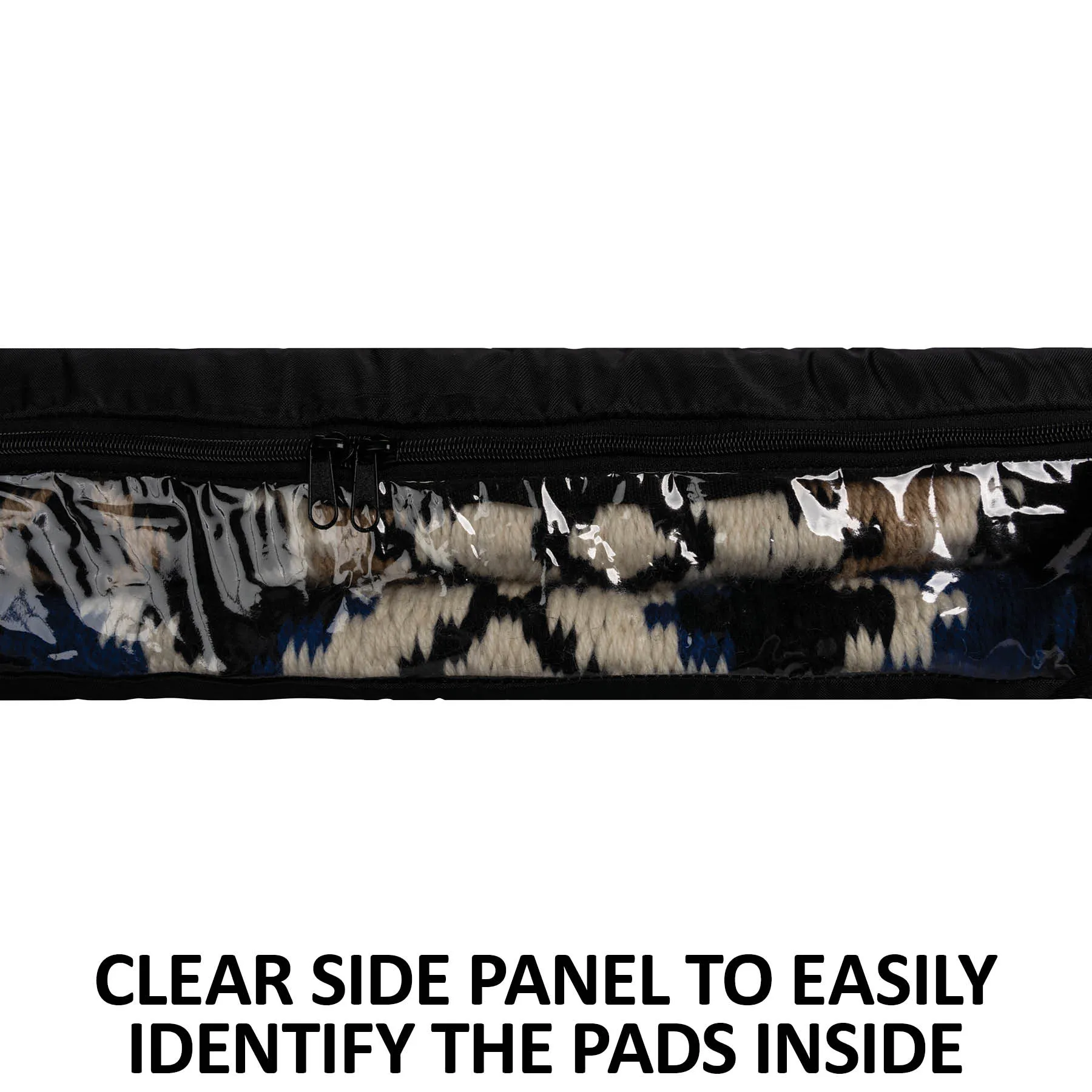 Keep your pads clean and organized with the Dura-Tech® Clear View Western Saddle Pad Bag Carrier that stores one Western show pad or two Western Show blankets. 420D polyester bag with a convenient see-through panel for easy identification. The bag dimensions are 42″ long x 20″ tall x 3″ deep.