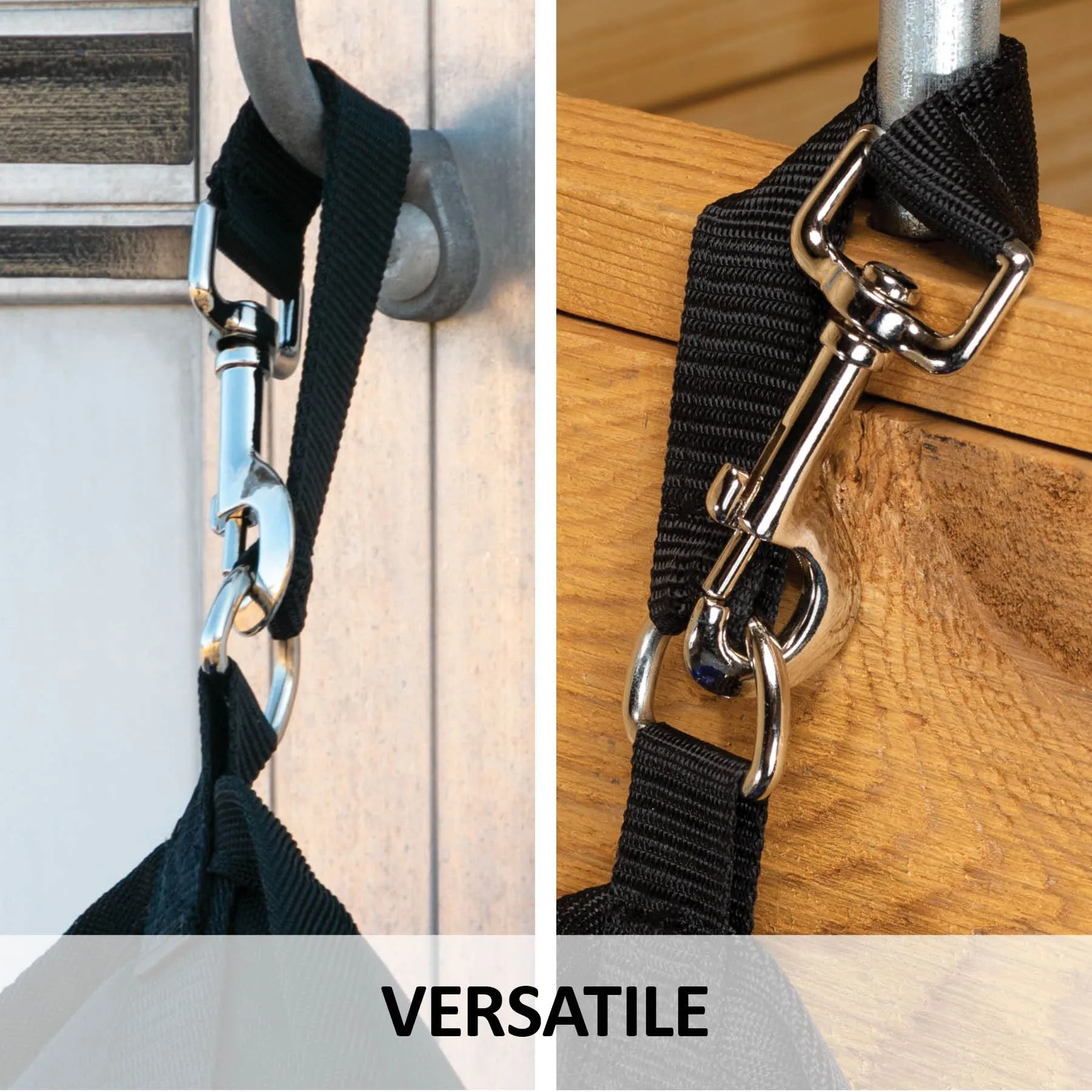 Holds the standard 20 Qt bucket conveniently at the side of your trailer and attaches easily around your steel tie mounts at the perfect height for your horse to eat or drink while tied. These are also great for horse shows, trail riding, and hanging a bucket without having bucket hangers or hooks available.