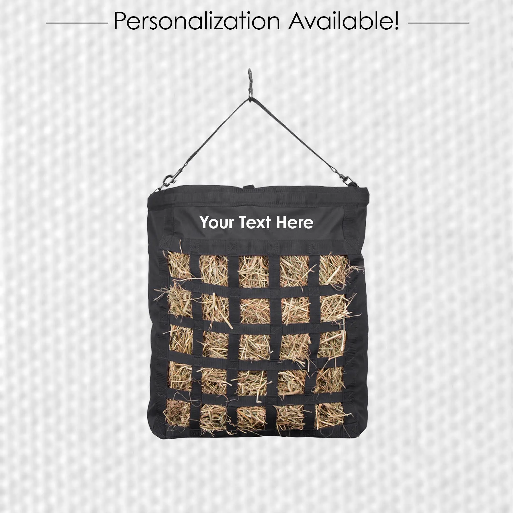 This durable slow feed hay bag holds 3-4 flakes of hay, our easy stay-open top rim makes filling a breeze.