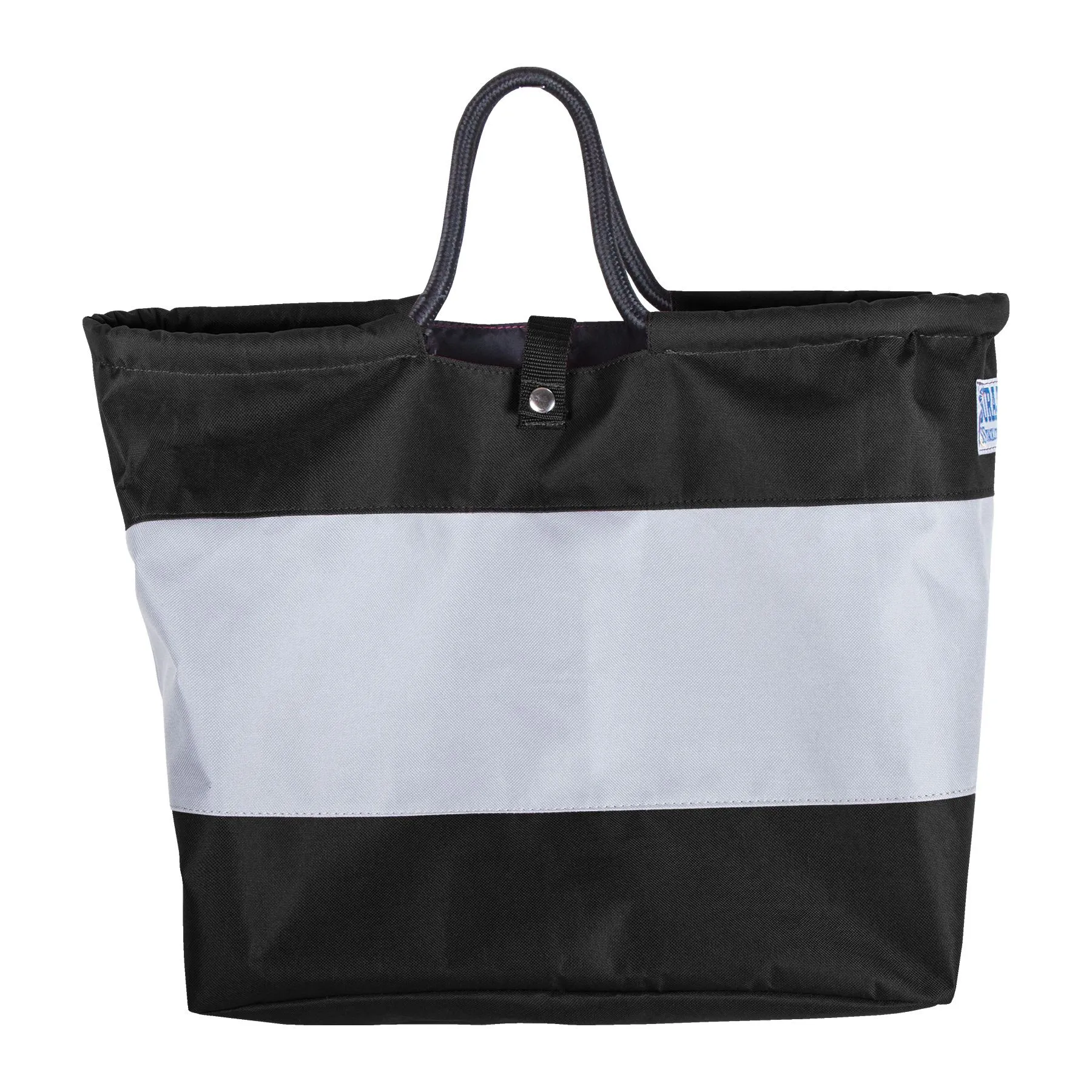 Open tote bag with rope handles and button snap closure, perfect for carrying a variety of essentials both at the barn or horse shows!