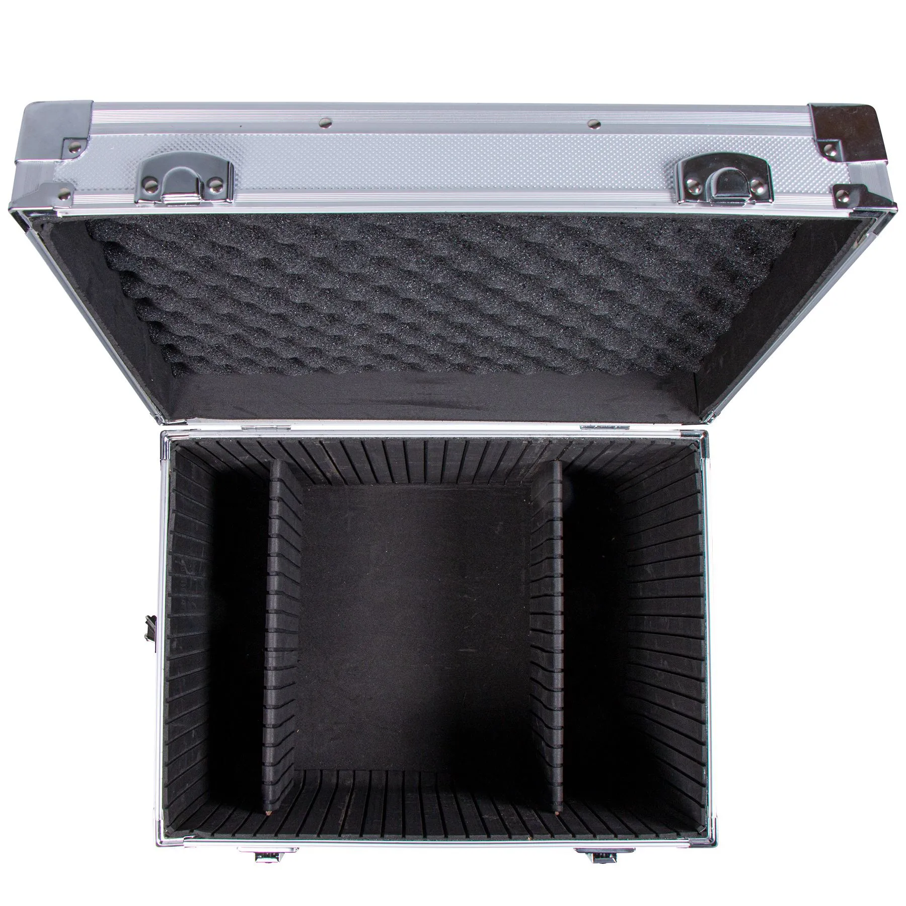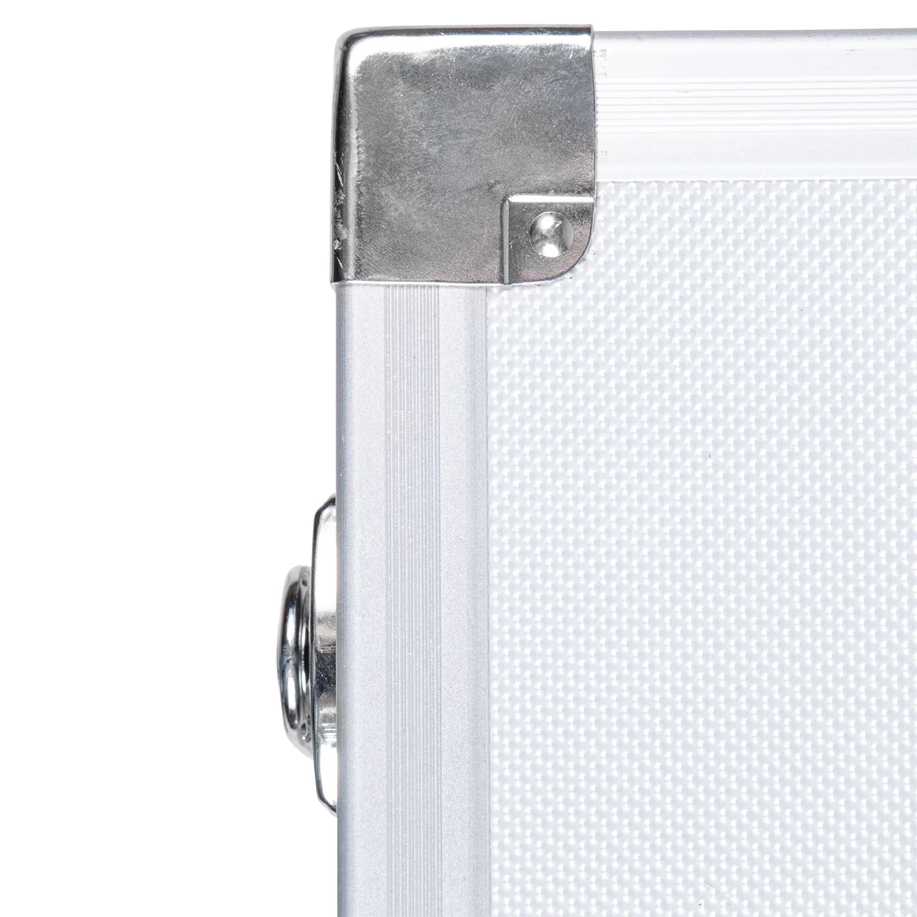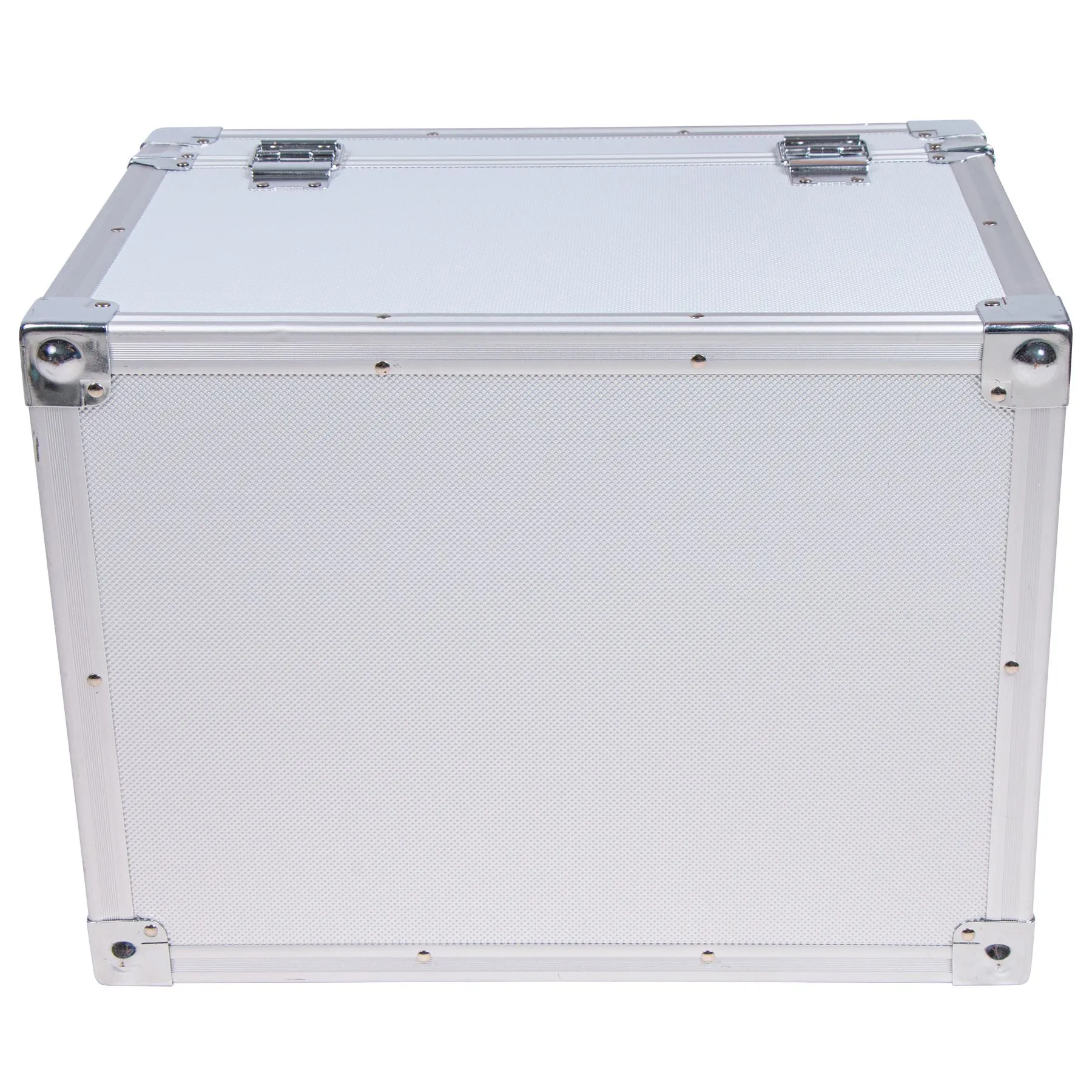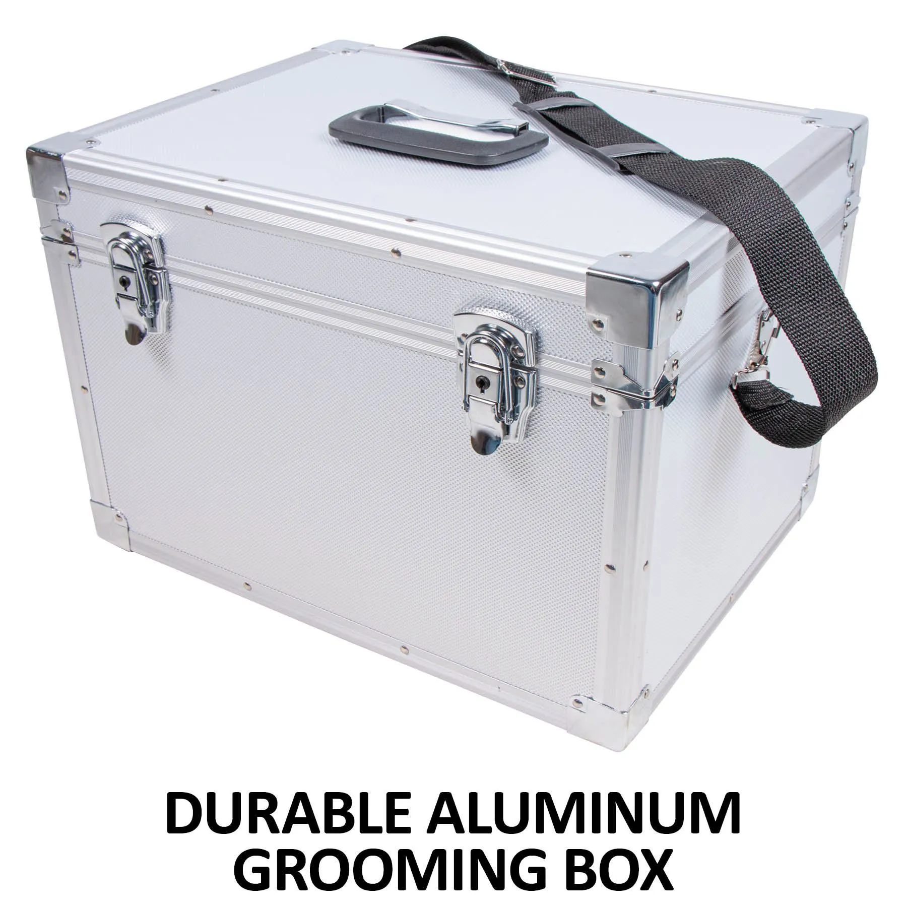 Strong aluminum grooming box, with a lock lid, padded inside large compartment for added durability. Carry handle and carry strap for overall size 15 1/2″ wide x 12″ tall x 12″ deep.