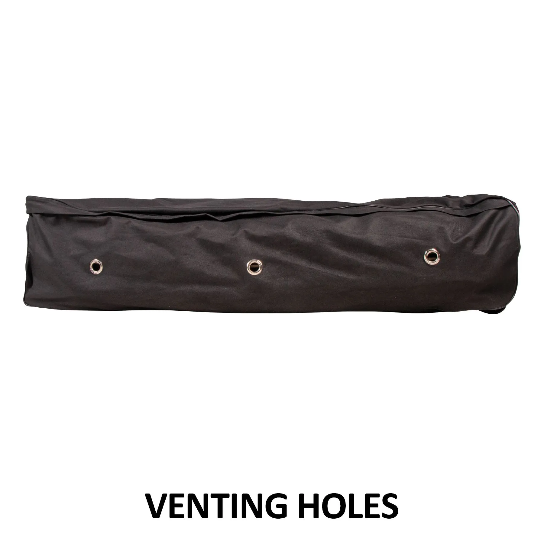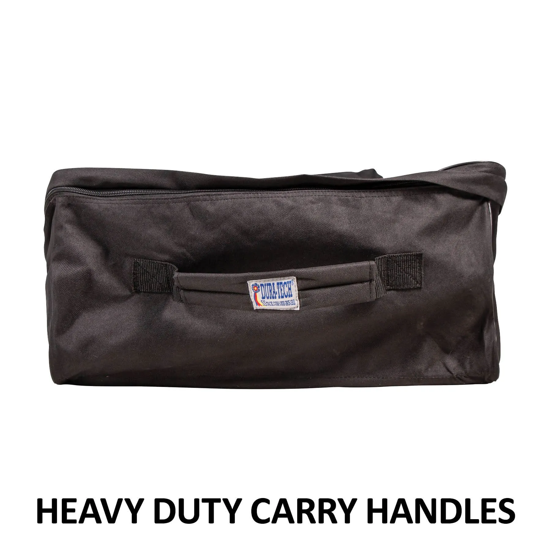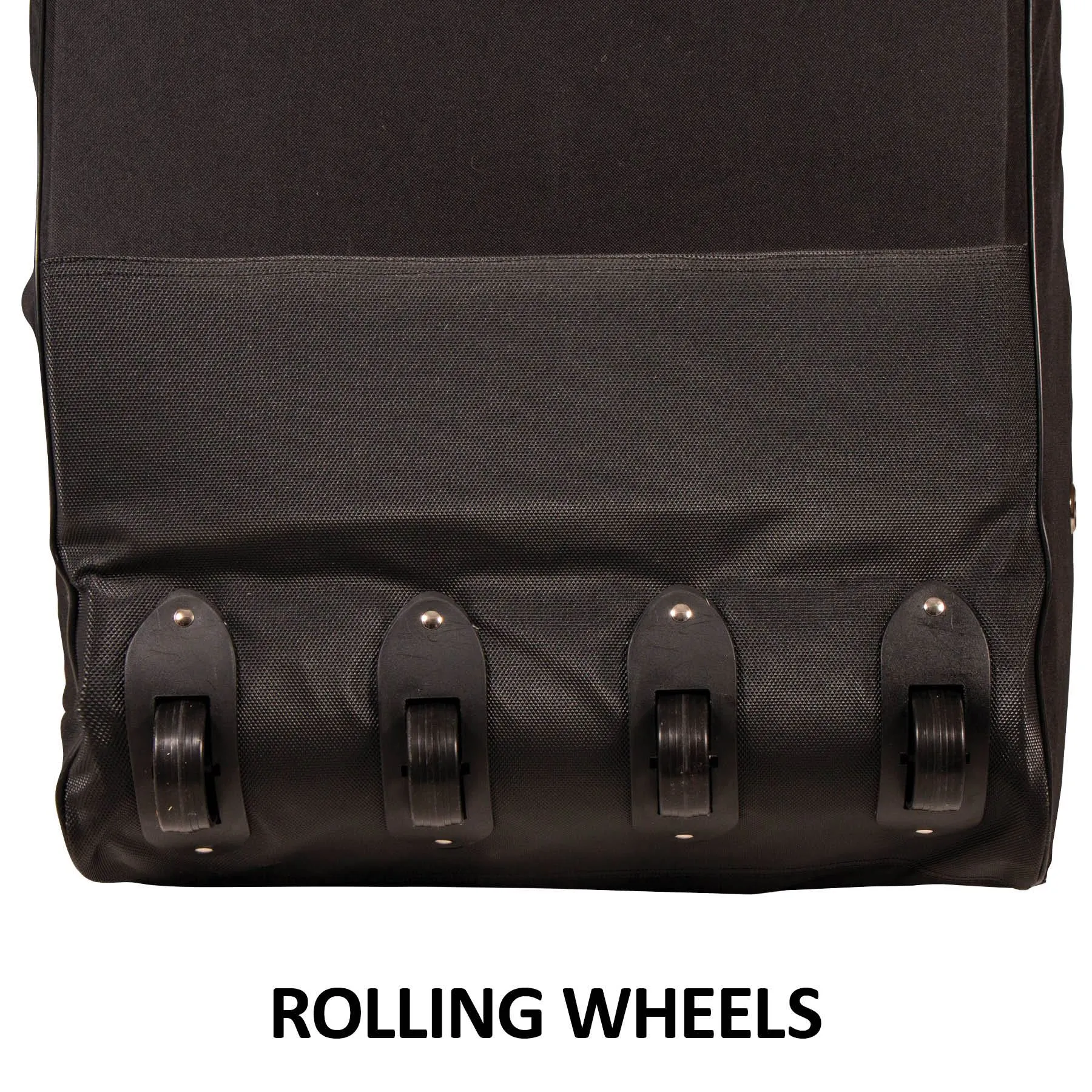 Made of strong 600D poly with a full zipper lid, this rolling saddle pad bag makes it easier to move your heavy saddle pads from barn or trailer to horse shows. Can hold up to 5 western work pads, 8 oversized wool show pads. If you don’t want to use this for pads, convert to a rolling hay bag or storing and hauling some Easy-Up items. Black only. Size: 40″ long x 20″ wide x 10″ high.