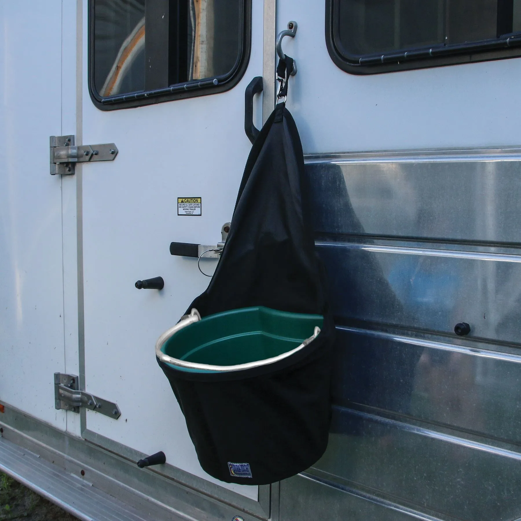 Holds the standard 20qt bucket conveniently at the side of your trailer and attaches easily around your steel tie mounts at the perfect height for your horse to eat or drink while tied. These are also great for horse shows, trail riding, and anywhere you want to hang a bucket without having bucket hangers or hooks available.