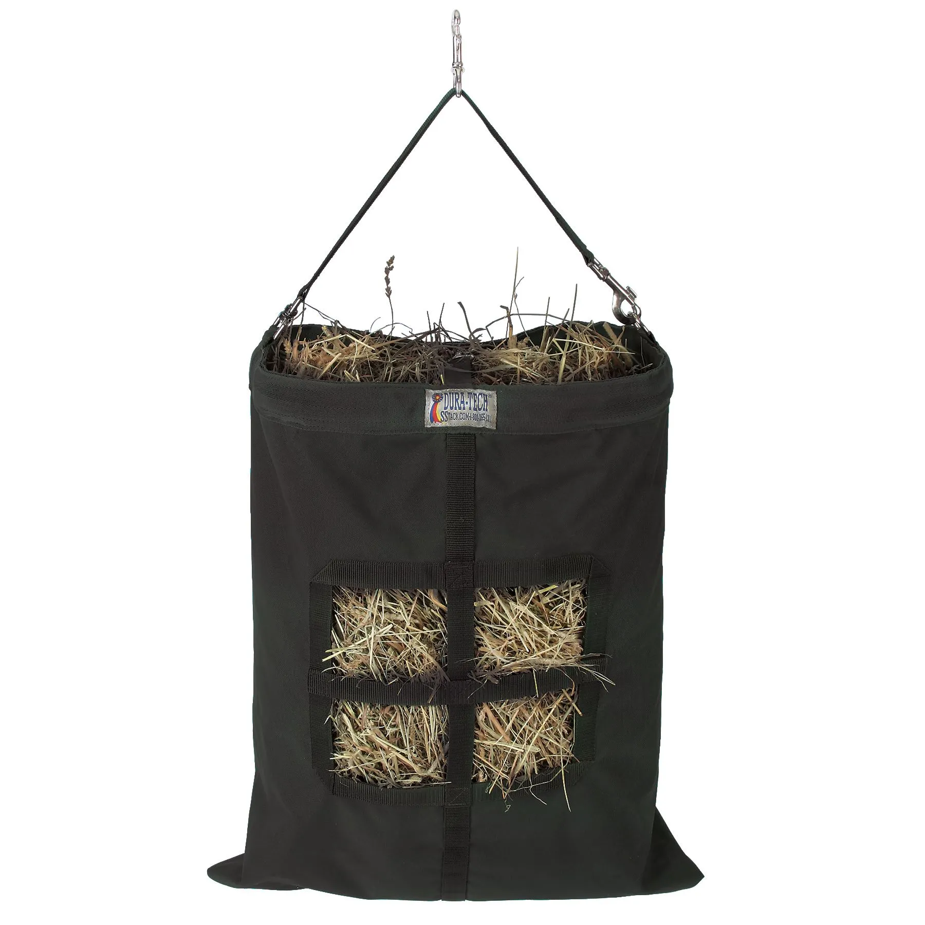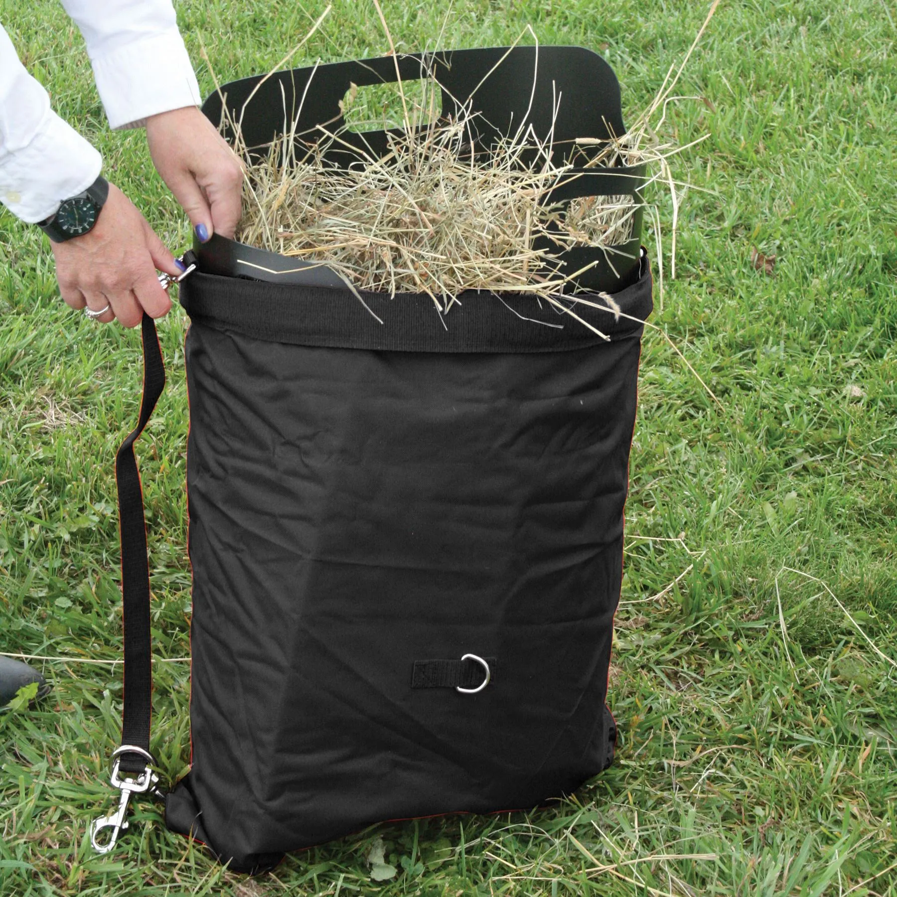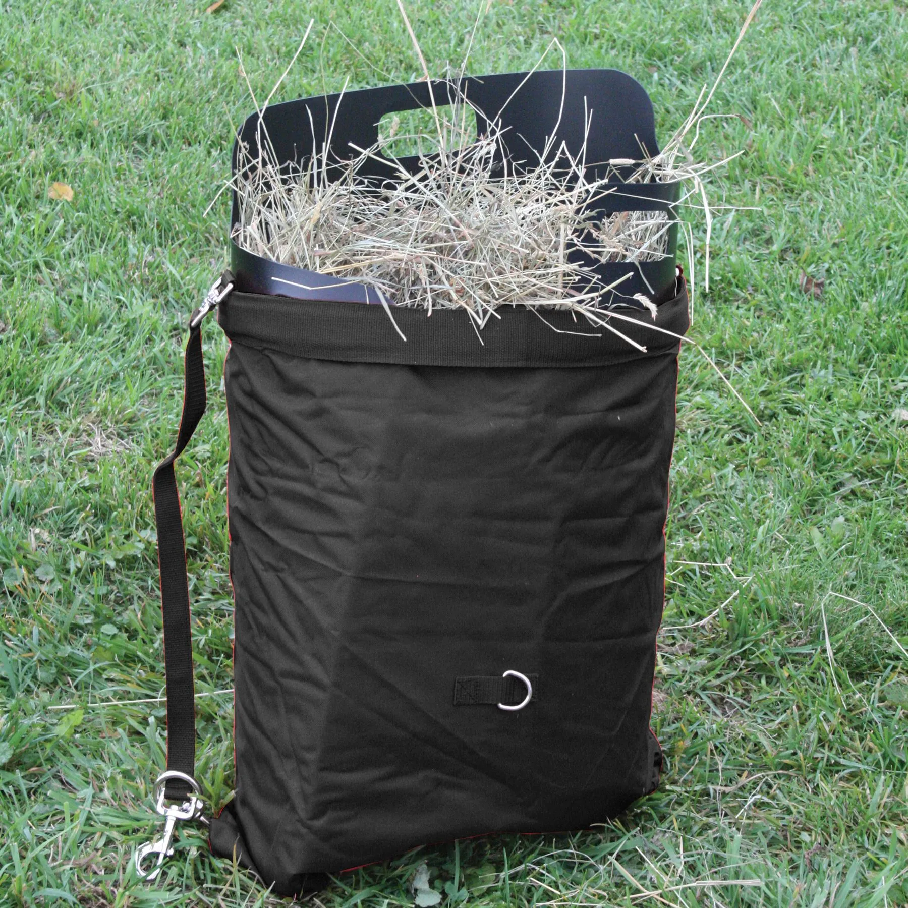 - Reinforced steel band at top holds bag open to fill and allows hay to filter down easily